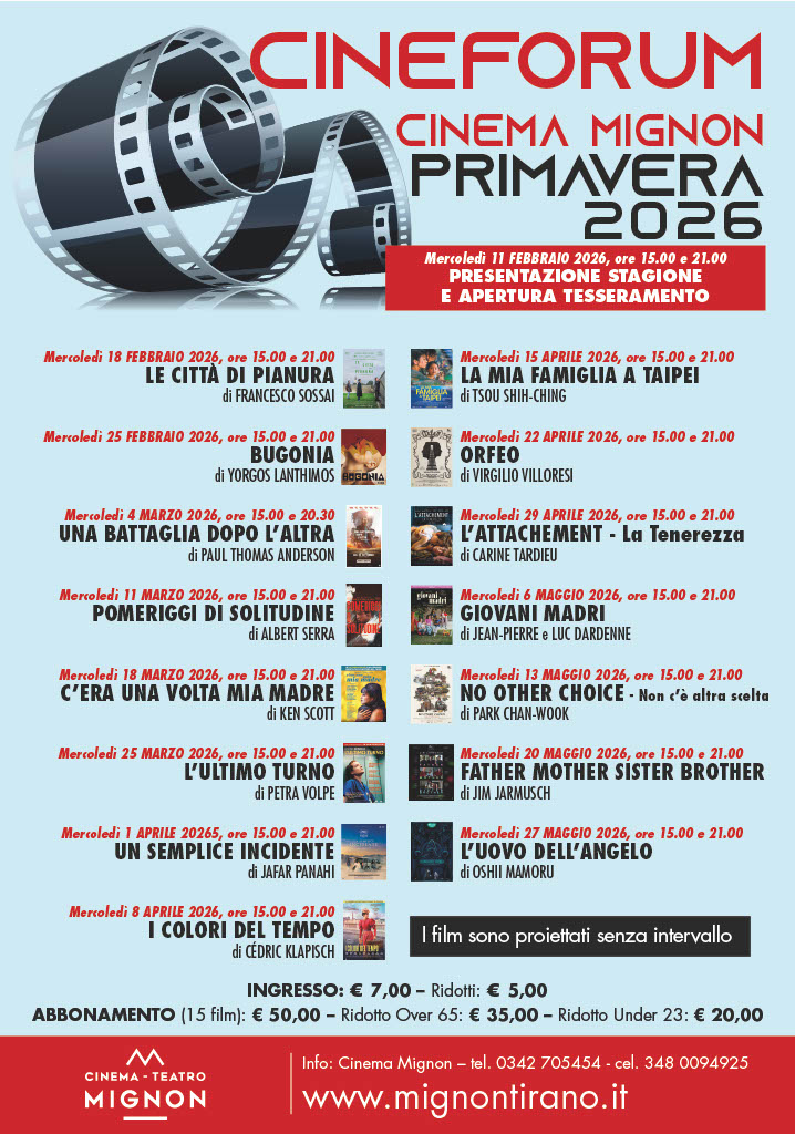 CINEFORUM PRIMAVERA 2026 Mercoledì 11 febbraio alle 15.00 e alle 21.00PRESENTAZIONE E APERTURA TESSERAMENTO INGRESSO LIBERO
